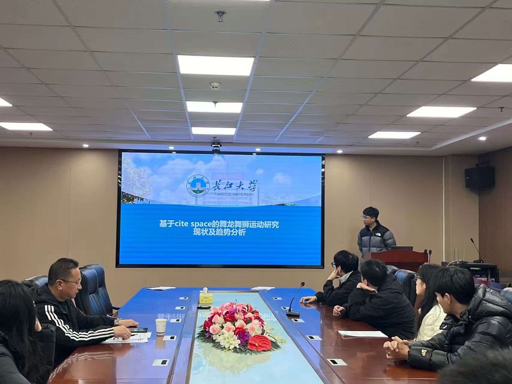 首先,王小帅以《基于Cite Space的舞龙舞狮运动研究现状及趋势分析》为题,运用文献计量工具对近年来该领域的研究动态进行可视化分析。汇报系统梳理了舞龙舞狮研究的发展脉络,识别出核心作者群与研究热点,并指出当前研究在理论深度与实践结合方面的不足。他进一步从文化传承、教育融合、赛事创新等角度,提出舞龙舞狮现代化发展的可行路径,为这一传统体育项目的学术研究与现实发展提供了清晰的图景与建议。