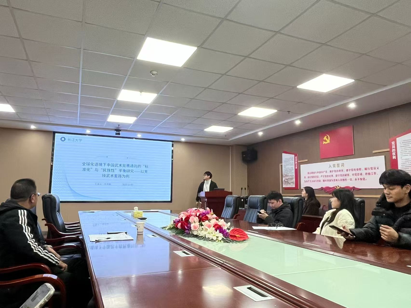 最后,李思腾关注中国武术在国际化进程中面临的规则建构问题,在《全球化语境下中国武术竞赛规则的“标准化”与“民族性”平衡研究》中,他以竞技武术套路为案例,探讨如何在遵循国际体育规则共性趋势的同时,保持武术特有的文化内涵与身体语言。通过比较分析不同赛事规则与评判体系,他指出当前标准化过程中存在的“文化折扣”现象,并提出应通过动作命名、评分维度、展演形式等多维度嵌入民族元素。该汇报引发了在座师生对传统体育现代化与身份认同的深入思考。
