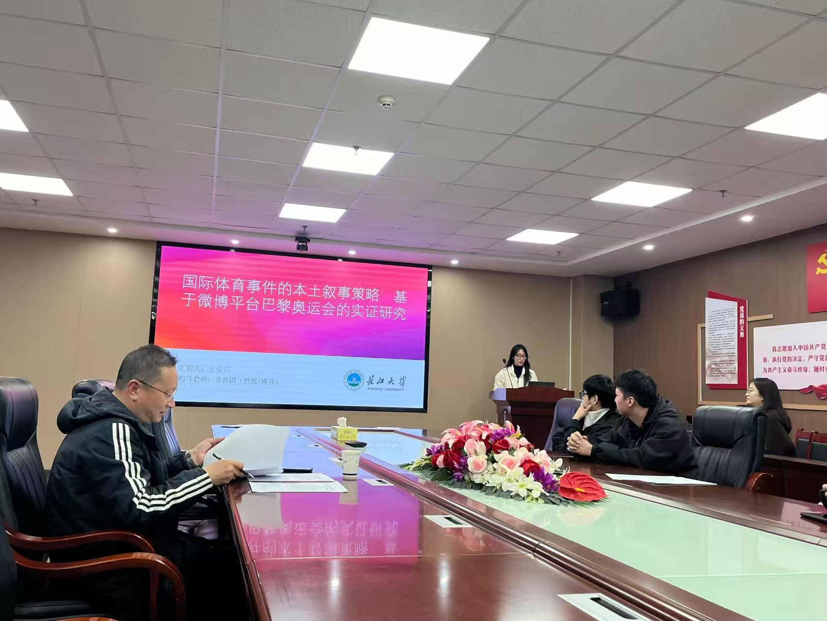 王曼云聚焦于新媒体环境中的体育文化传播,其研究《国际体育事件的本土叙事策略:基于微博平台巴黎奥运会的实证研究》,通过抓取与分析微博相关话题数据,探讨大型国际赛事在本土社交平台中的话语建构与受众互动。她详细展示了研究方法与技术路线,包括内容分析、情感倾向识别与传播网络描摹,初步研究发现公众对奥运的关注呈现“情感化”“符号化”与“社区化”特征。汇报引发了现场师生对体育媒介传播、本土化表达与受众参与机制的广泛讨论。