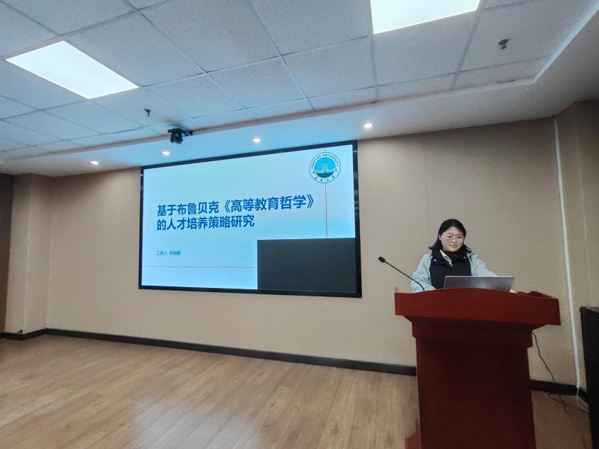 其次,李婉晴在《基于布鲁贝克<高等教育哲学>的研究生培养策略研究》中,以布鲁贝克提出的认识论与政治论相统一的高等教育哲学为基础,深入探讨了学术自由与社会责任、学生主体发展与多元化培养之间的辩证关系。汇报强调,研究生教育应兼顾知识前沿探索与社会实践需求,通过改革课程与教学方法、强化学术研究与社会实践结合、加强导师队伍建设以及营造自由包容的学术文化,构建“以生为本”的培养体系,从而培养出具备创新精神、批判思维和社会责任感的高素质人才。