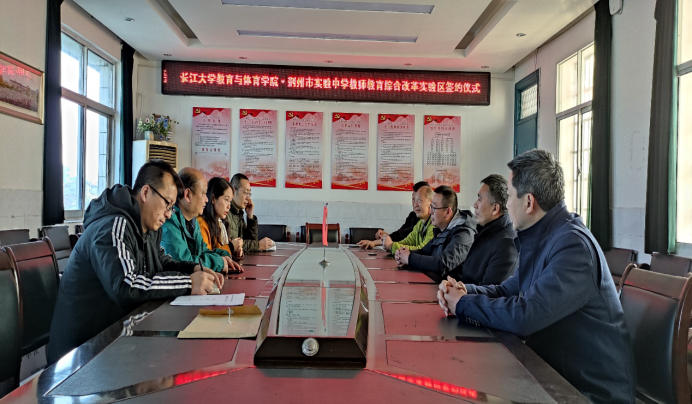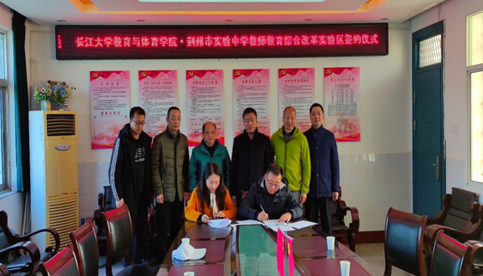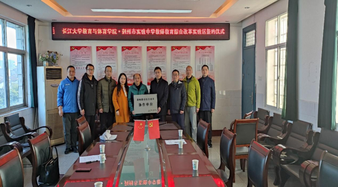 2021年3月12日上午,为了更好推动“教师教育综合改革实验区”建设,长江大学教师教育学院(biwn必赢)与荆州市实验中学正式签署“教师教育合作协议”,开启了双方在职前职后教师联合培养培训方面的全面合作。我校教师教育学院党委书记高明成、副院长张艳红、体育教育系主任杨青宝、社会体育指导与管理系主任孔祥魁及体育课程与教学论教师王剑副教授、荆州市实验中学校长倪磊、副校长汤组军、科研处主任王用华、体音美教研员谭海林及体育组组长张文举等参加了签约仪式。