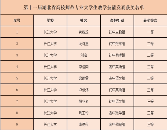11月25日至27日,第十一届湖北省普通高校师范专业大学生教学技能竞赛举行。我校15名选手参赛,9名选手获奖,我院黄锐蕊获初中生物组一等奖。