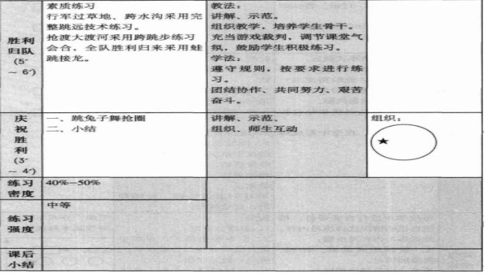 结束部分在音乐的伴奏下进行跳兔子舞抢圈的娱乐游戏,庆祝胜利,使学生身心充分得到放松。