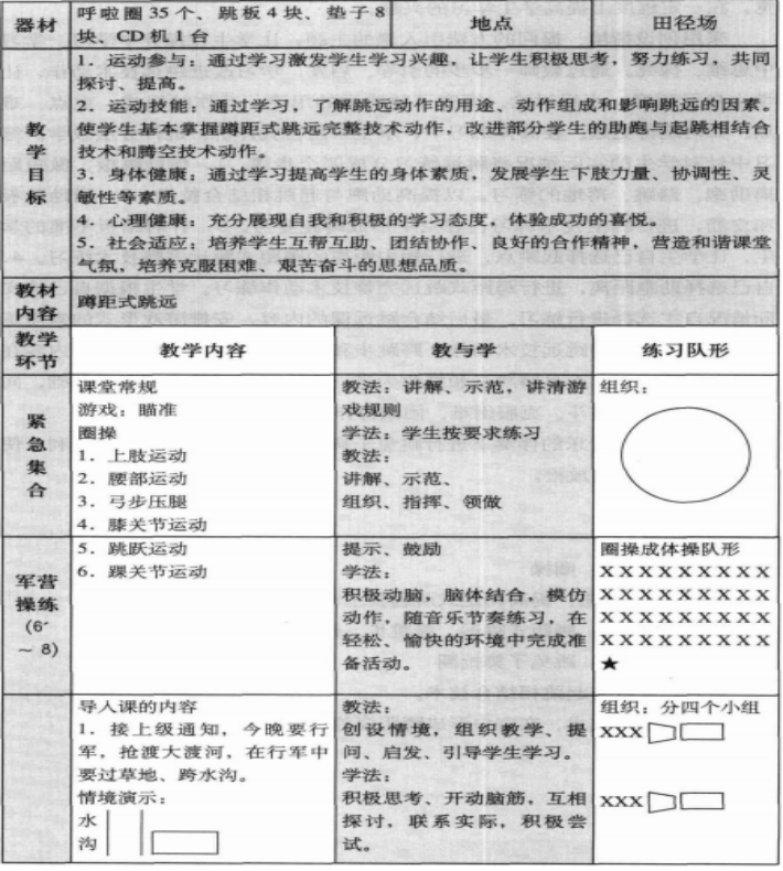 高二年级学生有一定的跳远基础,大多数学生能完成蹲距式跳远的完整技术动作,但学生的掌握程度参差不齐,个别差异明显。在助跑与起跳相结合和腾空技术上需进一步改进提高。